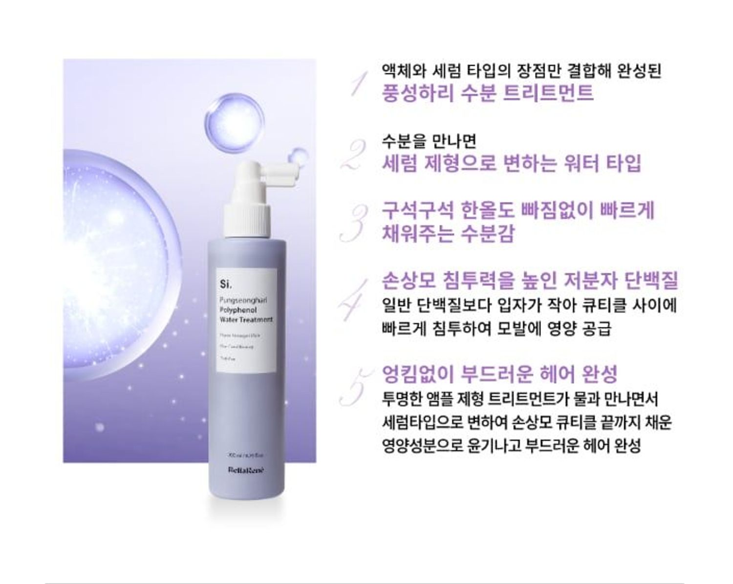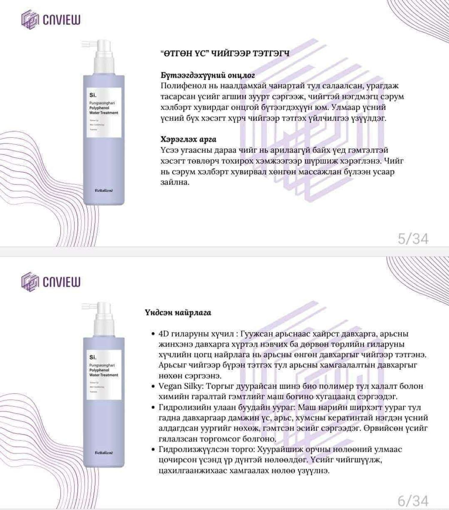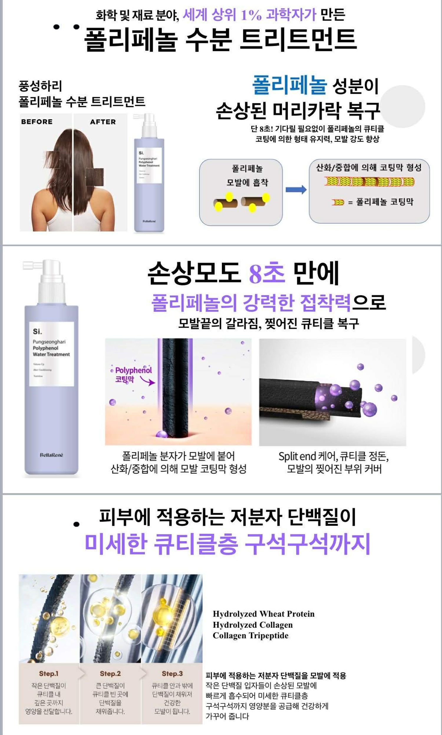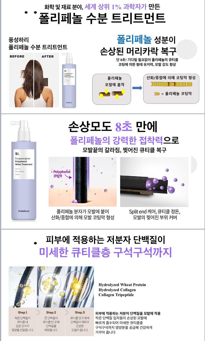 Полифенол технологи нь наалдамхай чанартай тул салаалсан, тасарсан үсийг агшин зуурт сэргээж устай нэгдэн сэрум хэлбэрт хувирах ба үсний бүх хэсэгт хүрч чийгээр тэтгэнэ.